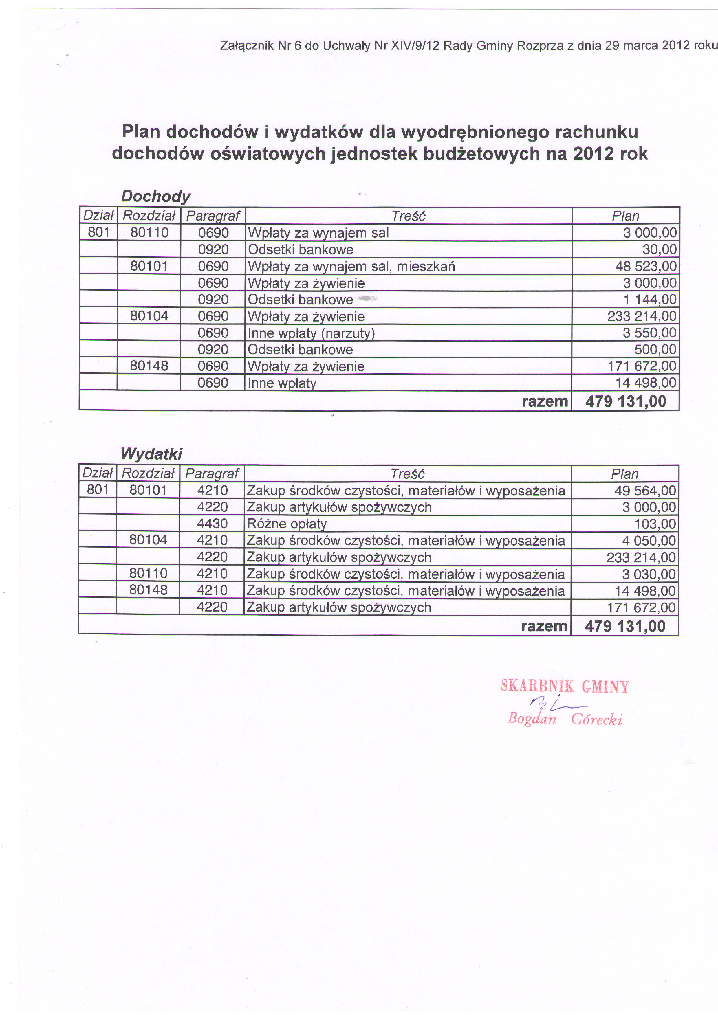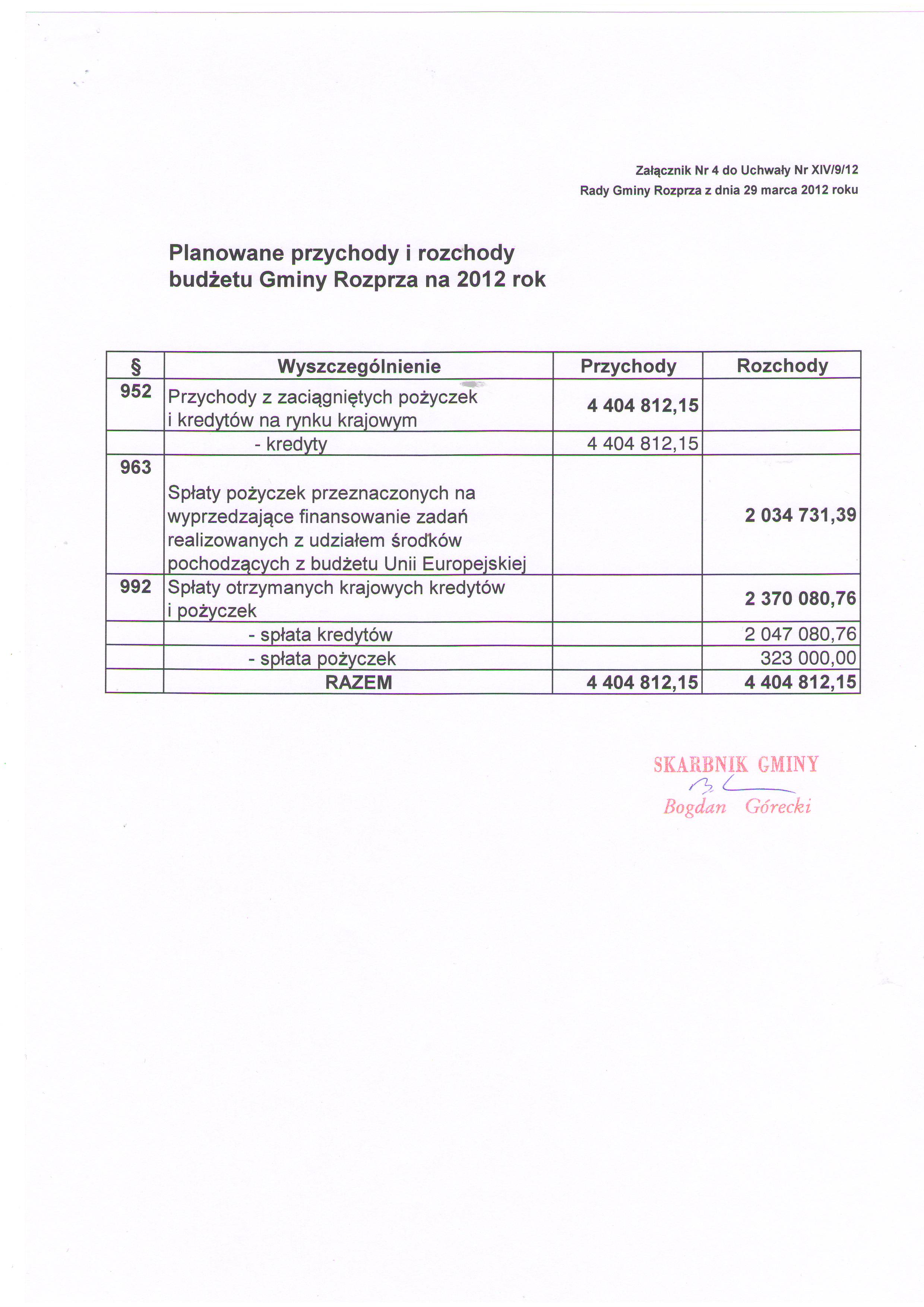 Rada Gminy w Rozprzy uchwala co następuje: § 1. Wprowadza się zmiany w planie dochodów i wydatków budżetowych na 2012 rok. § 2. Zmiany o których mowa w § 1 dotyczą: 1. Zwiększenia planu dochodów budżetowych, zgodnie z załącznikiem nr 1. 2. Zmniejszenia i zwiększenia planu wydatków budżetowych, zgodnie z załącznikiem nr 2. § 3. 1. Wprowadza się zmiany w limicie wydatków na inwestycje realizowane w 2012 roku zgodnie z załącznikiem nr 3. 2. Ustala się plan przychodów i rozchodów budżetu Gminy Rozprza na 2012 rok zgodnie z załącznikiem nr 4. 3. Aktualizuje się wykaz dotacji planowanych do udzielenia z budżetu w 2012 roku podmiotom należącym oraz nienależącym do sektora finansów publicznych zgodnie z załącznikiem nr 5. 4. Ustala się plan dochodów i wydatków dla wyodrębnionego rachunku dochodów oświatowych jednostek budżetowych na 2012 rok zgodnie z załącznikiem nr 6. § 4. Budżet po zmianach wynosi: 1. Plan dochodów budżetowych – 31.464.973,00 zł, w tym: - dochody bieżące – 29.117.131,00 zł, - dochody majątkowe – 2.347.842,00 zł. 2. Plan wydatków budżetowych – 31.464.973,00 zł, w tym: - wydatki bieżące – 27.386.072,86 zł, - wydatki majątkowe – 4.078.900,14 zł. § 5. 1. Spłata pożyczek i kredytów zaciągniętych w latach poprzednich w kwocie 4.404.812,15 zł zostanie sfinansowana kredytem. 2. Ustala się łączną kwotę przychodów w wysokości 4.404.812,15 zł. § 6. 1.Ustala się limity zobowiązań z tytułu kredytów i pożyczek zaciąganych na: 1) sfinansowanie przejściowego deficytu budżetu – w kwocie – 1.500.000,00 zł, 2) spłatę wcześniej zaciągniętych zobowiązań z tytułu zaciągniętych pożyczek i kredytów – w kwocie – 4.404.812,15 zł, 2. Ustala się limit na obsługę długu z tytułu zaciągniętych kredytów i pożyczek w kwocie: – 650 000,00 zł § 7. Wykonanie uchwały powierza się Wójtowi Gminy. § 8. Sprawozdanie z wykonania uchwały złoży Wójt Gminy łącznie ze sprawozdaniem z wykonania budżetu Gminy za 2012 rok. § 9. Uchwała wchodzi w życie z dniem podjęcia i podlega ogłoszeniu w trybie przewidzianym dla aktów prawa miejscowego. Przewodniczący Rady Gminy Tomasz Gemel
