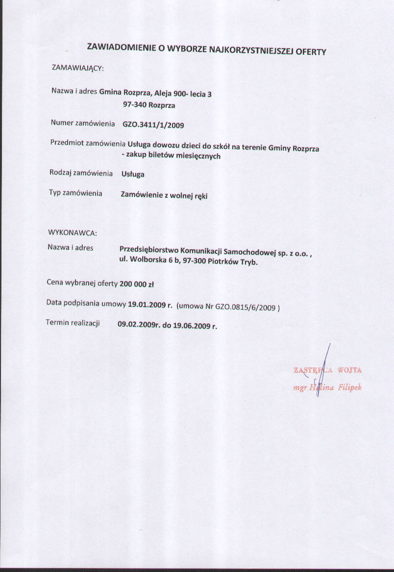 | zamówienie na: | Usługa dowozu dzieci do szkół na terenie Gminy Rozprza - zakup biletów miesięcznych |