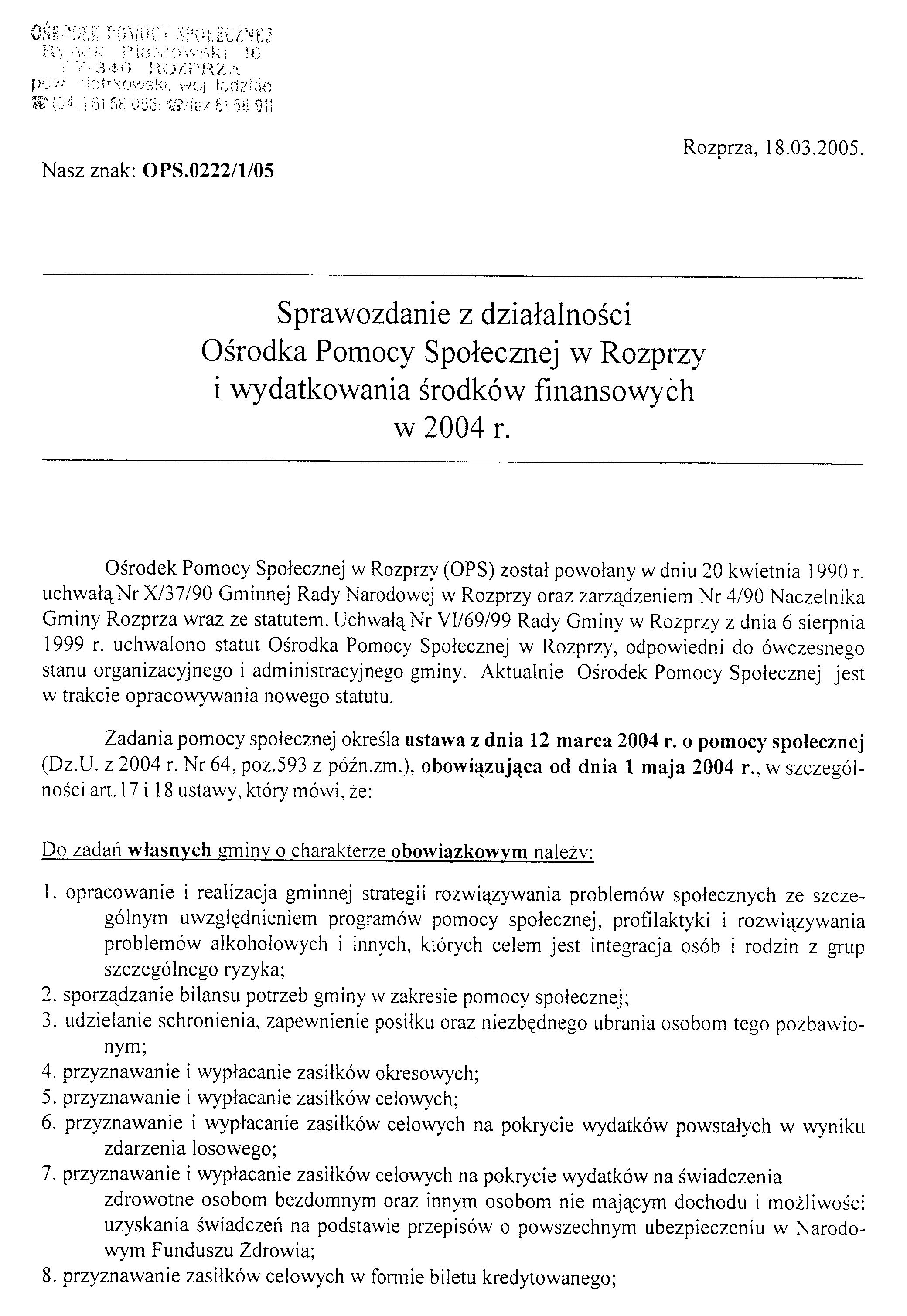 Sprawozdanie z działalności Ośrodka Pomocy Społecznej w Rozprzy i wydatkowania środków finansowych w 2004r /całość/ Spr OPS Rozprza za 2004 r.doc (114kB) plik