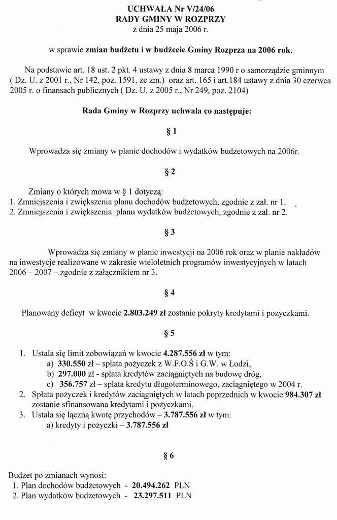 Uchwała V/24/06 z dnia 25 maja 2006r w sprawie zmian budżetu i w budżecie Gminy Rozprza na 2006r STR_1 1.JPG (84kB) jpg