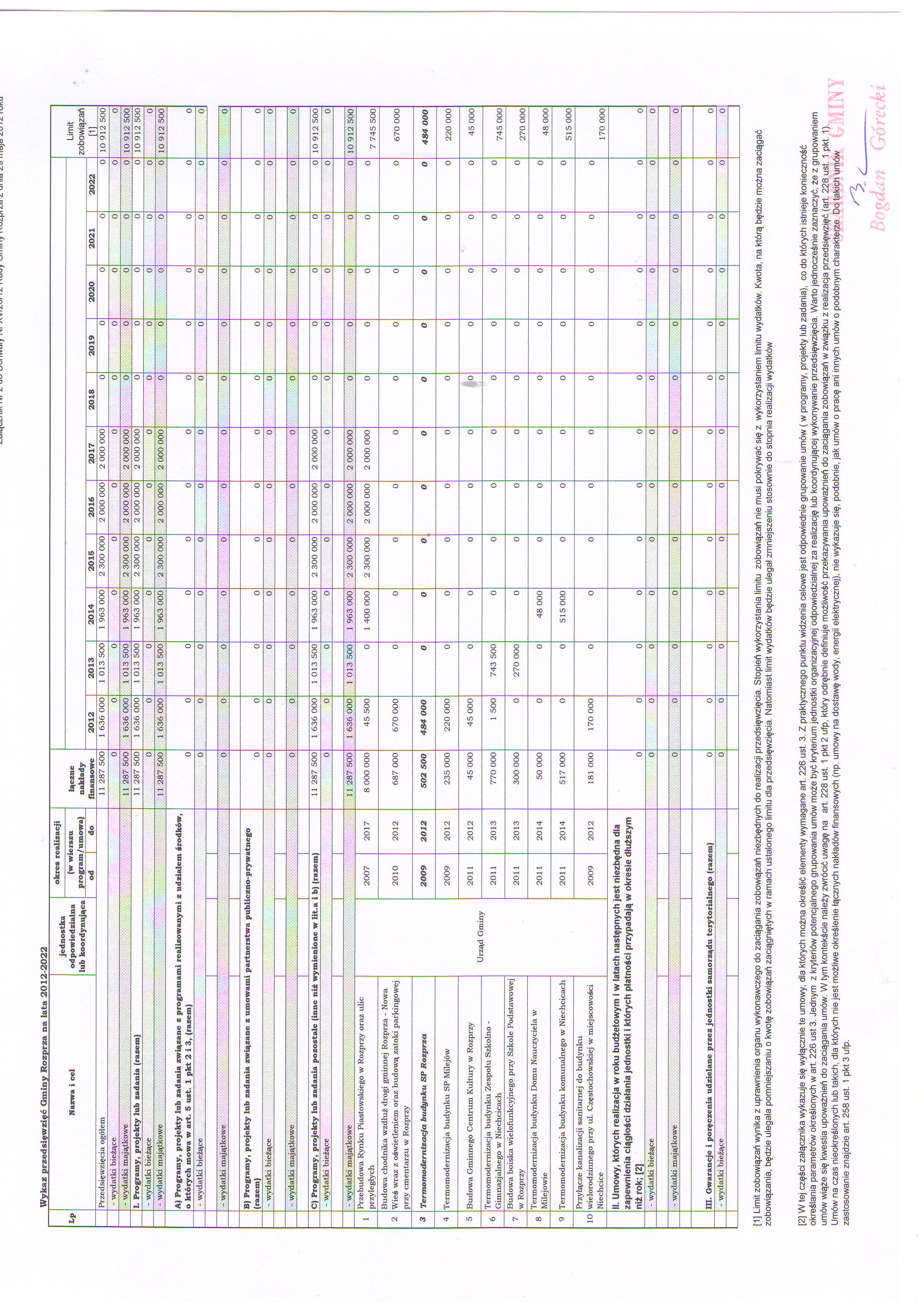 Rada Gminy w Rozprzy uchwala co następuje: § 1. Wieloletnia Prognoza Finansowa Gminy Rozprza na lata 2012 - 2022 otrzymuje brzmienie zgodnie z załącznikiem nr 1. § 2. Wykaz przedsięwzięć Gminy Rozprza na lata 2012-2022 otrzymuje brzmienie zgodnie z załącznikiem nr 2. § 3. Przyjmuje się objaśnienia dla zmienianych wartości przyjętych w § 1 i § 2 zgodnie z załącznikiem nr 3. § 4. 1. Upoważnia się Wójta Gminy do zaciągania zobowiązań związanych z realizacją przedsięwzięć określonych w załączniku nr 2. 2. Upoważnia się Wójta Gminy do zaciągania zobowiązań z tytułu umów, których realizacja w roku budżetowym i w latach następnych jest niezbędna do zapewnienia ciągłości działania jednostki i z których wynikające płatności wykraczają poza rok budżetowy. § 5. Upoważnia się Wójta Gminy do przekazania uprawnień kierownikom jednostek organizacyjnych gminy do zaciągania zobowiązań z tytułu umów, których realizacja w roku budżetowym i w latach następnych jest niezbędna do zapewnienia ciągłości działania jednostki i z których wynikające płatności wykraczają poza rok budżetowy. § 6. Wykonanie uchwały powierza się Wójtowi Gminy. § 7. Uchwała wchodzi w życie z dniem podjęcia. Przewodniczący Rady Gminy Tomasz Gemel załącznik nr 1